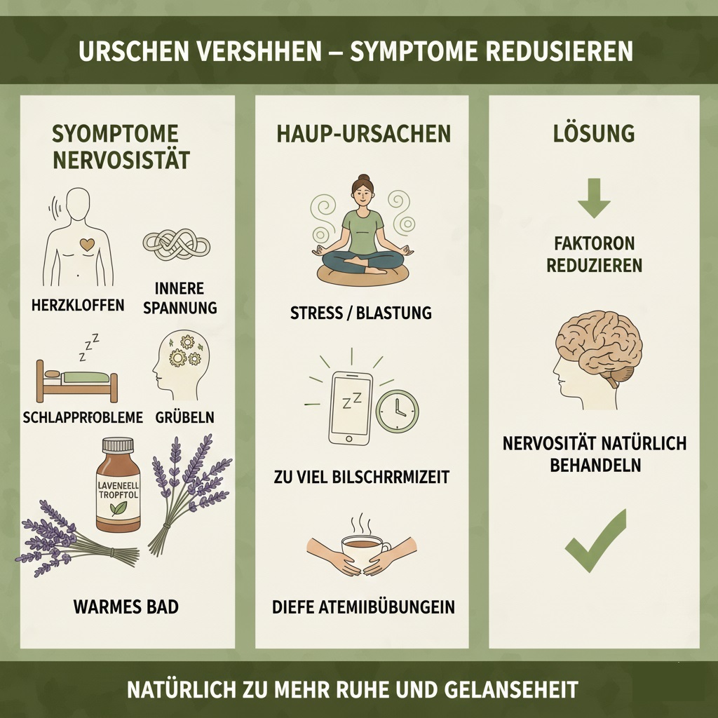 Häufige Nervosität-Symptome sind Herzklopfen, innere Spannung, Schlafprobleme oder Grübeln. Die wichtigsten innere Unruhe-Ursachen sind Stress, Überlastung, zu viel Bildschirmzeit und unregelmäßiger Schlaf. Wer diese Faktoren reduziert, kann die Nervosität natürlich behandeln und langfristig mehr Ausgeglichenheit erreichen.
